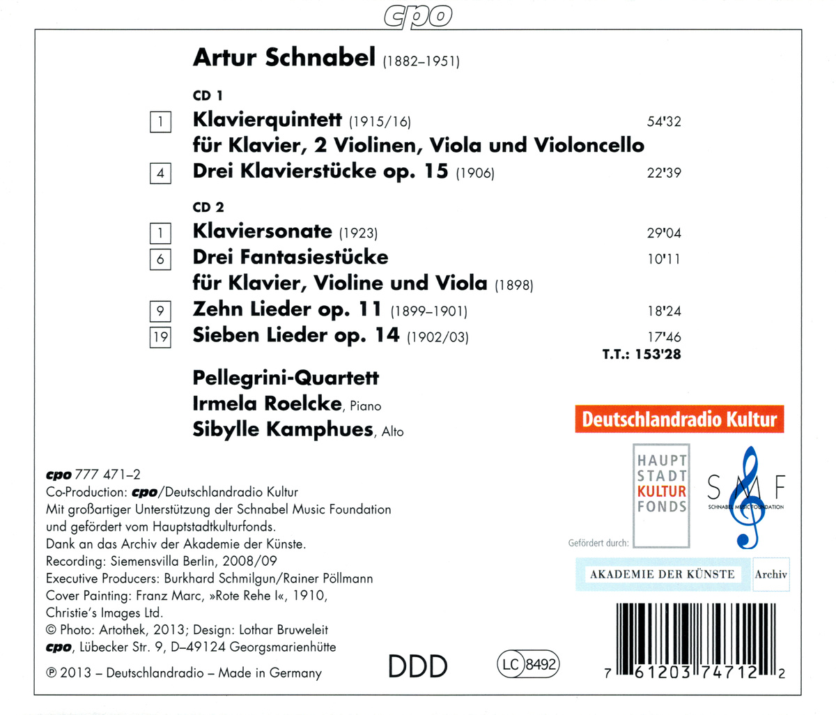 Die Doppel-CD präsentiert ein breites Spektrum des kammermusikalischen Oeuvres und Liedschaffens von Artur Schnabel. Herzstück ist das monumentale Klavierquintett von 1915/16, das Irmela Roelcke wiederentdeckt und der Öffentlichkeit zugänglich gemacht hat. Zum einen der Tradition des großen romantischen Tons verpflichtet, beschreitet Schnabel hier zum anderen mit seiner genuin eigenen Sprache neue Wege.